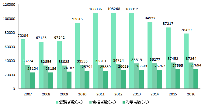 全国にある看護学校の受験者数と合格者数と入学者数